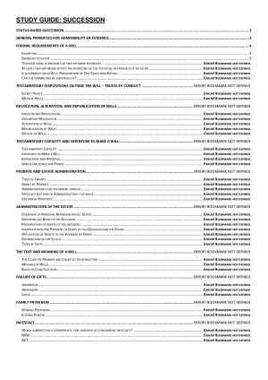 Final exam mark: 85 These notes are a detailed study guide catered to a final Succession exam with problem questions. The notes distinguish the relevant rules for both NSW and ACT jurisdictions. The topics covered include: - Formal Requirements of a Will; - Testamentary Dispositions outside the Will; - Revocation, Alteration, and Republication of Wills; - Testamentary Capacity and Intention to Make a Will; - Probate and Estate Administration; - The Text and Meaning of a Will; - Failure of Gifts; - Family Provision (Eligibility only); and - Intestacy. The Study Guide includes helpful ACT and NSW mindmaps for the eligible beneficiaries under the rules of intestacy, eligible applicants for family provision, and guidance on the payment of estate debts. These mindmaps were created by the author of these notes. The notes make detailed references to specific sections of the Succession Act 2006 (NSW), the Wills Act 1968 (ACT), the Administration and Probate Act 1929 (ACT), and the Probate and Administration Act 1898 (NSW).