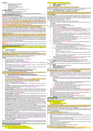 My 4 page cheat sheet used during the final exam. The topics are ordered in the order you would expect to address issues when answering a problem question. Covers the following topics: - The threshold question of whether the CCA applies; - Misleading or Deceptive Conduct; - Unconscionable Conduct; - Unfair Contract Terms; - Unsolicited Consumer Agreements; - Consumer Guarantees; - Remedies; - Manufacturer's Liability; - Action for Damages against Manufacturers; - Indemnification of Suppliers by Manufacturers.