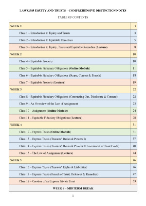 These distinction notes cover all of the prescribed readings, cases, online module and lecture content for the term in a clear and well-structured manner. Given the immense amount of contact hours for the course and the extensive weekly prescribed readings these notes will be a definite time saver. I have also compiled a colour-coded table of contents at the beginning of the document (attached in the sample) which provides a clear structure to the note set and makes it easy to find information which you are looking for. With these notes I was able to achieve a distinction in both the midterm and final exam and a high distinction (90) for class participation. Topics covered include: - Introduction to equity, trusts and equitable remedies - Equitable property - Equitable fiduciary obligations - The law of assignment - Express trusts - Equitable tracing - The law of priorities - Personal liability of accessories and recipients - Resulting Trusts - Constructive Trusts - Equitable remedies (personal and proprietary) - Bars to equitable relief