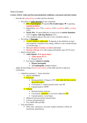 - Topics from all weeks and lectures are covered: Week 1: Clinical reasoning and musculoskeletal physiotherapy examination, Diagnostic triage, identification of serious spinal pathology and risk stratification Week 2: Lumbar spine: impairments & management (manual therapy), Lumbar Spine: Management of Nerve Root Compromise Week 3: Imaging of the musculoskeletal system, Lumbar Spine: epidemiology, aetiology and natural history Week 4: Lumbar Spine: Impairments and Management – Advice, Lumbar Spine: Impairments and Management – Exercise Week 5: Evidence-based Practice (EBP) – Diagnostic validity, Evidence-based Practice – Psychometric properties of rating scales / questionnaires as outcome measures Week 8: Musculoskeletal Injuries & Conditions of the Hip and Groin Week 9: Tendinopathy: aetiology and interventions Week 10: Assessment and interventions for acute and chronic knee musculoskeletal conditions Week 11: Bone injuries: diagnosis, classification and healing Week 12: Ankle and foot musculoskeletal conditions: assessment and intervention Week 13: Putting it together: Lower limb case studies - Lecture, tutorial and reading contents are summarized in the notes in addition with self-researches - Case study and evidence study are also included with relevant descriptions, interpretations and implications - There are personal insights at the end of each of the topic to emphasize the important components of that lecture where you can focus more on - The notes are combined with words, colours and figures which are in great detail and comprehensive to help you achieve an HD