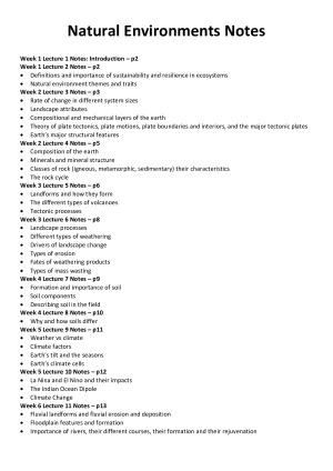 Quality, detailed up-to-date subject notes covering 11 weeks and 20 lectures. Also contains glossaries of key terms for each lecture and an index of the content of each lecture. Topics covered: • Definitions and importance of sustainability and resilience in ecosystems • Natural environment themes and traits • Rate of change in different system sizes • Landscape attributes • Compositional and mechanical layers of the earth • Theory of plate tectonics, plate motions, plate boundaries and interiors, and the major tectonic plates • Earth’s major structural features • Composition of the earth • Minerals and mineral structure • Classes of rock (igneous, metamorphic, sedimentary) their characteristics • The rock cycle • Landforms and how they form • The different types of volcanoes • Tectonic processes • Landscape processes • Different types of weathering • Drivers of landscape change • Types of erosion • Fates of weathering products • Types of mass wasting • Formation and importance of soil • Soil components • Describing soil in the field • Why and how soils differ • Weather vs climate • Climate factors • Earth’s tilt and the seasons • Earth’s climate cells • La Nina and El Nino and their impacts • The Indian Ocean Dipole • Climate Change • Fluvial landforms and fluvial erosion and deposition • Floodplain features and formation • Importance of rivers, their different courses, their formation and their rejuvenation • Aeolian processes and land formation • Different forms of aeolian erosion • Land resource issues and resilience risks • Coastal processes • Landscape ecology, definition, components and concepts • Endemism • Landforms local to Melbourne • Regional landforms • Soils in different climates • Concept of Terroir and its importance in vineyards • Biodiversity and its importance • Soil and soil health • Catchments and the different inputs to catchments • Metathinking, anthropocentrism, and ecocentrism • Production in the Mallee Land capability, land capability assessment, land suitability, land capabi