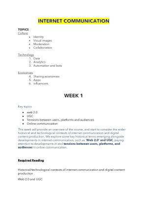 my notes is separated into FOUR main sections topics for the individual week >> to give an overview of the most essential point that needs to be understood by students notes summarised in my own words readings & recommended readings/videos few further readings are listed under each week >> to provide further assistance to students who want to read further & also can help with assignment research! TOPICS COVERED -web and UGC -tensions between users, platforms and audiences -production of identity -affordances of digital media -personal, visual and cultural expression -evolution and importance of visual images -digital photography and mobile phone cameras -memes, filters, emojis and GIFs -crowd-sourcing and collaboration -surveillance capitalism -self-tracking -personal data management -web bots -sharing economies -interfaces of apps -social media infuencers -self branding