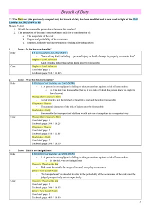 What’s covered? These notes cover the entire torts course in scaffolded form for the problem question. Cases and legislation are colour-coded. All cases and legislation covered in the course are in the scaffold. Topics: - Breach of duty - Causation - Concurrent liability - Breach of statutory duty - Defences: contributory negligence, voluntary assumption of risk, illegality, dangerous recreational activity, minor defences - Damages: general information, economic loss, non-economic loss, apportionment