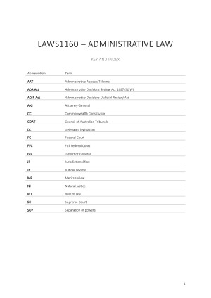 Covers all readings and cases from the CURRENT TEXTBOOK as covered in the course in T3 2020: - Introduction - Merits review - Judicial review: scope, standing, reasons - Acting without power - Fact-finding errors - Unlawful delegation - Statutory interpretation - Procedural fairness - Errors in discretion - Improper purpose - Relevant/irrelevant considerations - Unlawful use of policy - Unreasonableness - Jurisdictional error - Remedies - Statutory restrictions
