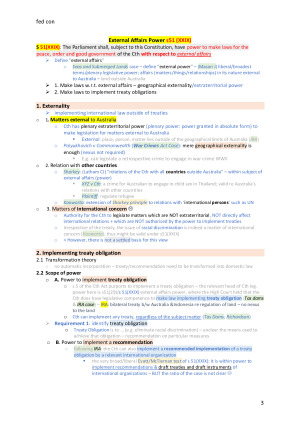 Succinct exam scaffolds that would help you go through the steps to answer exam questions and would be extremely useful under exam condition Topics included: - Corporations Power - External Affairs Power - Defence Power - Implied Freedom of Political Communication - Freedom of Interstate Trade - Taxation - Grants Power