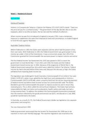 Detailed Tax Notes which covers content from week 1-7 only, including: * Residence and Source * Labour Tax * Business Tax * Property Tax * Capital Gains * General Deductions * Specific Deductions Very clearly set out/easy structure.