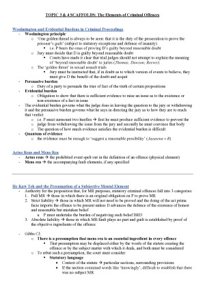 This is a comprehensive yet concise set of reading notes which will allow you to excel in the unit. It covers in detail the entire course and all the weeks, including: - the elements of criminal offences - homicide: murder - homicide: manslaughter - assault offences - larceny - extending criminal liability: complicity - extreme provocation - self-defence - necessity and duress - mental illness and SIAM - automatism - use of evidence of mental illness or self-induced intoxication to negate intent I completed LAWS1016 with a D mark of 75.