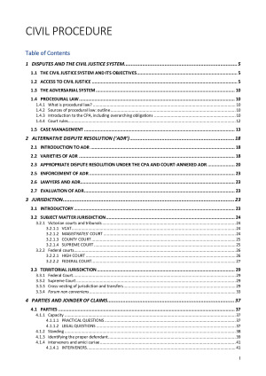 Received highest mark in cohort for subject. All topics covered: disputes and the civil justice system; ADR; jurisdiction; parties and joinder of claims; commencing proceedings, service and appearance; class actions; protecting positions; technology for solving legal problems; costs; defining the issues in dispute; gathering evidence; disposition and enforcement. Notes use decimal headings system with table of contents: see sample.