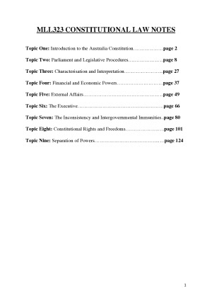 MLL323 CONSTITUTIONAL NOTES All Topics Covered (Notes from lectures, seminars and readings) Topic One: Introduction to the Australia Constitution Topic Two: Parliament and Legislative Procedures Topic Three: Characterisation and Interpretation Topic Four: Financial and Economic Powers Topic Five: External Affairs Topic Six: The Executive Topic Seven: The Inconsistency and Intergovernmental Immunities Topic Eight: Constitutional Rights and Freedoms Topic Nine: Separation of Powers
