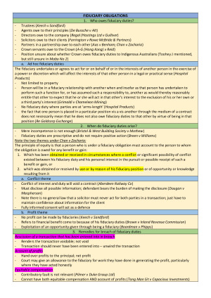 I used these notes my primary source of information for my final exam. I received a distinction in the final exam and a distinction overall. Topics include: - History and Nature of Equity - Applications of the Conscience of Equity - Remedial Equity - The Nature of Constitution of Trusts - Operation of Express Trusts - Fiduciary Obligations - Constructive Trusts - Tracing - Charity