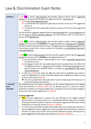 Structured Exam notes with skeletons for problem questions and pre-prepared text to write in exams. The notes include all content for the entire course, principles for each case under the relevant subheading and clear colour coding and formatting. The notes cover the below topics and are based on lectures given by Dr Colin Campbell: - Topic 1 - Types of Discrimination Recognised by Australian Law - Topic 2 - The Legal Basis of Anti-Discrimination Law - Topic 3 - The Sex Discrimination Act 1984 (Cth) - Topic 4 - The Disability Discrimination Act 1992 (Cth)