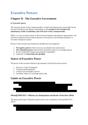 These notes are detailed (but summarised) notes on the assessable content in Australian Constitutional Law. They contain background on each content and power as well as key cases with the facts and holdings outlined. Features of Notes: 1. Organised by headings and subheadings 2. Covers all assessable powers 3. Includes notes explaining the process of characterisation 4. Outlines key cases (with facts, holdings and implications) 5. Gives an overview of the structure of the Constitution The topics covered in these notes are: 1. Structure of the Constitution 2. Characterisation of Commonwealth Laws 3. The Defence Power 4. Executive Powers 5. Nationhood Power 6. Judicial Power 7. Aliens Power 8. External Affairs Power 9. Trade and Commerce Power 10. Indigenous Sovereignty and the Race Power 11. Acquisition of Property on Just Terms 12. Implied Freedom of Political Communication 13. Right to Trial by Jury 14. Inconsistency of Laws For each power the notes outline: 1. The source of the power 2. Scope and limits 3. Applicable tests 5. Key cases 6. Approach to Characterisation 7. Summary points These notes are put together from a number of sources including the provided subject materials ( lectures and readings), the required textbook, supplementary textbooks, legal commentary and other online sources. These notes are all you need for this subject and with these notes you will not have to write notes on the lectures, seminars or from the textbook. Within the 98 pages of these notes everything you need to know for this subject is covered in clear dot point structure.