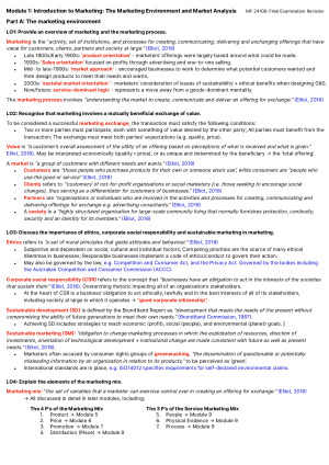 This is a complete summary of the Marketing Foundations course. It includes notes from lecture slides and the textbook, and each module has generally been condensed into one double-sided A4 paper (2 pages), although some may be a little longer. This document covers ALL modules: - Module 1: Introduction to Marketing: The Marketing Environment and Market Analysis - Module 2: Market Research - Module 3: Consumer Behaviour - Module 4: Markets: Segmentation, Targeting and Positioning - Module 5: Product - Module 6: Price - Module 7: Promotion - Module 8: Distribution (Place) - Module 9: Services, Social and Not-for-profit Marketing - Module 10: Digital and International Marketing - Module 11: Data analytics and business buying behaviour