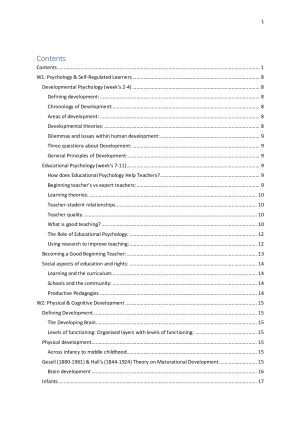 These notes are made up of lecture, tutorial and readings from the 11 weeks of EDFD140. Reading notes are drawn from Woolfolk, A., & Margetts, K. (2016). Educational Psychology. (4th ed). Melbourne, VIC: Pearson Australia. Topics covered include: - Developmental Psychology (Physical & Cognitive), - How Educational Psychology helps teachers - Theories of developmental psychology, - Learner differences (Intelligence & gender), - Personal, emotional and social development, - Ethnicity, SES & Bio-Ecological Systems Theory, - Behavioural Views of Learning, - Social Cognitive Views of Learning, - Motivational Views of Learning