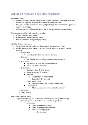 These are my subject notes which cover each lecture topic presented throughout the semester in detail. These include: - Module 2: Introducing cognitive psychology - Module 3: Memory 1 - Module 4: Memory 2 - Module 5: Memory 3 - Module 6: Attention 1 - Module 7: Attention 2 - Module 8: Problem solving - Module 9: Decision making - Module 10: Language 1 - Module 11: Language 2 - Module 12: Language 3 - Module 12: Cognitive neuroscience Each lecture module has been broken down into comprehensible dot points which makes the content easier to understand and build upon. Please note that these notes do not contain any exam/assignment information, such as quizzes, practice questions, hints, ect. They are purely lecture summaries.