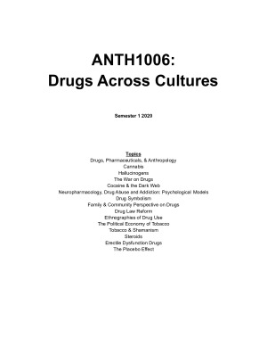 Lecture and Reading notes for whole semester - everything needed for exam (basically) topics included Drugs, Pharmaceuticals, & Anthropology Cannabis Hallucinogens The War on Drugs Cocaine & the Dark Web Neuropharmacology, Drug Abuse and Addiction: Psychological Models Drug Symbolism Family & Community Perspective on Drugs Drug Law Reform Ethnographies of Drug Use The Political Economy of Tobacco Tobacco & Shamanism Steroids Erectile Dysfunction Drugs The Placebo Effect