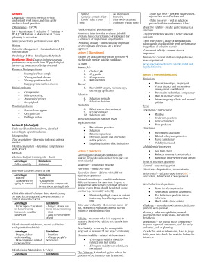 Summary notes Week 1 - 12 I used for the final exam! W1: Intro to Organisational Psychology W2: Recruitment & Selection W3: Personnel Selection W4: Occupational Stress, Applications & Work Design W5: Employee Development and Workplace Training & Career and Job Choice W6: Motivation & Justice W7: Personality & Applications W8: Discretionary Behaviour & Interpersonal Mistreatment in the Workplace W9: Culture W10: Introduction to Human Factors W11: Teams in an Organisation & Leaders and Leadership W12: Performance Management