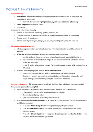 Complete and descriptive notes for Principles of Immunology. I wrote these throughout the semester from the lectures and textbook (Janeway's Immunobiology). They are extensive and cover all the contents tested in the MSTs and Final Exam. Key words in bold and colour used to help visual learners, like myself. Content is covered in modules rather than lectures to make it easier to study cohesively and be able to relate different concepts together, which is key to doing well in the subject. I studied using only these notes and got a 90 in the subject. Good luck! Contents: Module 1: Innate immunity Module 2: Adaptive Immune recognition Module 3: Adaptive immune development and response Module 4: Immune memory and regulation Module 5: Immune disease