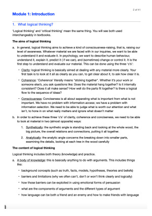 Hi, These are my study notes for Introduction to Logical Thinking (101189) from the lectures and tutorials and book (Critical thinking: A student’s Introduction, 2011). My notes are detailed but concise. I have formatted my notes so that they are easy to read and follow, by using large font size and relevant diagrams. I am a HD student studying Bachelor of Psychology (Honours). The modules covered are: Module 1: Introduction Module 2: Non-rational forms of persuasion and barriers to logical thinking Reading Module 3: Clarifying the ground rules Module 4: The double-edged sword of language: friend & enemy Module 5: Arguments - identifying, analysing & casting (diagramming) Reading Module 6: Deduction & induction Module 7: Evaluation arguments part 1 Module 8: Evaluating arguments part 2 Module 9: The “Ism’s” in psychology & why they matter Module 10: Conceptual issues & worldview in psychology Module 11: Evaluating psychological research - Theoretical, methodological and statistical issues Module 12: How do psychology, philosophy and science fit together? Module 13: Evaluation and revision