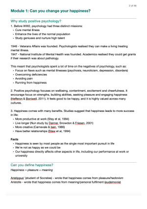 Hi, these are my study notes for Positive Psychology: The Science of Happiness, Resilience & Wellbeing (102606) from the lectures, tutorials and readings. My notes are detailed but concise. I have formatted my notes so that they are easy to read and follow, by using large font size and relevant diagrams. I am a HD student studying Bachelor of Psychology (Honours). The modules covered are: Module 1: Can you change your happiness? Module 2: Factors affecting wellbeing Module 3: Making space for the good stuff Module 4: Do positive emotions matter? Module 5: Resilience & thinking traps Module 6: Resilience and mindfulness Module 7: Cultivating optimism Module 8: Relationships Module 9: Character strengths Module 10: Happiness by design Module 11: Goals, motivation and keeping the change going Module 12: Mind & body