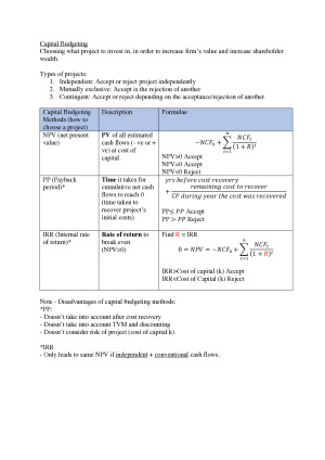 Summary/formulae of most important concepts (across all topics) in ACST1001. Notes are good as a cheat sheet for exams as they are concise but cover all relevant content in ACST1001. I used these notes in the final exam and achieved an HD in this unit (2021). Content covered: 1. TVM 2. Bonds 3. Shares 4. Capital budgeting 5. Risk and return 6. Raising Capital