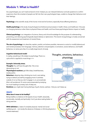 Hi, These are my study notes for Psychology & Health (101614). My notes are detailed but concise. I have formatted my notes so that they are easy to read and follow, by using large font size and relevant diagrams. I am a HD student studying Bachelor of Psychology (Honours). The modules covered are: Module 1: What is Health? Module 2: Health Psychology Module 3: Understanding health behaviours Module 4: Models of Health & Illness Module 5: Explaining Health Behaviours Module 6: Behaviour Change Module 7: Psychological Interventions Module 8: Abnormality Module 9: Adult Mood Disorders Module 10: Stress Module 11: Anxiety Disorders Module 12: Schizophrenia & Eating Disorders Module 13: Addictive Disorders & Personality Disorders Module 14: Injury & Illness Module 15: Health Behaviour (All images sourced from google)
