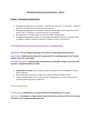 Full semester of subject notes. Topics: MANAGING AND ORGANISATIONS - Contemporary managing and organisations in a changing world - Digital organisation - Managing as sensemaking - Managerial rationality MANAGING ORGANISATIONAL DESIGN - Contingency theory - What designs matter? MANAGING PRINCIPLES - Foundations of management principles - Industrial management principles - Max weber and principles of bureaucracy - Redefining bureaucracy - Critical perspectives on principles of management MANAGING INDIVIDUALS - Psychology at work - Perception at work - Values: Managing me, myself and I - Personality - Positive psychology MANAGING TEAMS AND GROUPS - Team and group dynamics - Groups properties and processes - Developing teams - Team conflict and the darker side of teams - Toxic handling in teams - Defining leadership - The evolution of leadership theory - Leaders and coaches and motivators - Motivation - Positive psychology of leadership MANAGING HUMAN RESOURCES - HR origins - HRM in practice - HRM in context - Institutional shaping of HRM - The industrial relations climate MANAGING CULTURES - Organisational culture - Culture in practice - The culture of culture - Culture: Integrated, differentiated and fragmented - Measuring national cultures MANAGING CONFLICT - What is organisational conflict? - Managing conflict MANAGING POWER, POLITICS AND DECISION-MAKING IN ORGANISATIONS - Organisation power and politics - Why do organisations have politics? - Surveillance and resistance as organisational politics - Empowerment, experiments, emancipation, ethics MANAGING COMMUNICATIONS - Communication - Level of communication - Organisational communication and organisational design - Polyphonic communication MANAGING KNOWLEDGE AND LEARNING - Knowledge management - Driving forces behind knowledge and learning - Organisational learning as a paradox MANAGING INNOVATION AND CHANGE - Innovation as a process - Innovation as an open process - Innovation as an outcome: Dynamics of progression - Managing change and innovation - Organising for innovation MANAGING SOCIAL RESPONSIBILITY ETHICALLY - Corporate social responsibility - Going green - Corporate codes of ethics - The future MANAGING GLOBALISATION - Defining globalisation - Key strategic issues - Competitive advantage - Who and what are the globalisers? - Global managers and global jobs - Global rights - Global winners and losers - Global sustainability