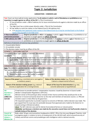 Complete and well-structured notes for LAW3112 (S1, 2020). Compiled and refined from lectures, tutorials, and personal research. Covers everything needed for all assessments. *Structured in a way that helps you work through the relevant legal issue step by step efficiently and thoroughly. Topics covered: 2. Jurisdiction 3. Standing 4. Reasons 5. Grounds of Review: Narrow and Broad Ultra Vires () 6. Procedural Fairness 7. Jurisdictional Error 8. Remedies 9. Privative Clauses 10. Merits Review Hope it helps !! :)