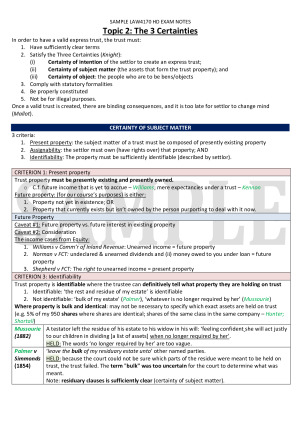 Complete and well-structured notes for LAW4170 Trusts (S1 2021). Compiled and refined from lectures, tutorials and personal research (case reports, legislation, etc.). Covers everything needed for all assessments. *Structured in a way that helps you work through the relevant legal issue step by step, efficiently and thoroughly. Topics covered: 1. Introduction and Classification of Trusts 2. The 3 Certainties 3. Quistclose Trusts 4. Charitable Purpose Trusts 5. Statutory Writing Formalities and Constituting the Trust 6. Trustees' Duties 7. Defences and Limitations on Liability 8. Rights of Trustees 9. Rights of Beneficiaries 10. Remedies Hope it helps !! :)