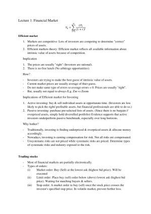 Useful, yet concise notes that summarize lecture slides and notes taken during lecture. I used this lecture notes and tutorial to do revision for final exam. I received 94% in my final exam. Hope this lecture notes can help you to improve your understanding and achieve H1! Topic covered: (1) Financial Market (2) Risk (3) Optimal Risky Portfolio (4) Capital Asset Pricing Model (5) Single Index Model (6) Multifactor Model (7) Fixed Income Fundamentals (8) Coupon bonds (9) Managing Fixed Income Portfolios (10) Portfolio Performance Evaluation