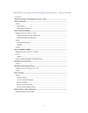 Hey, Thanks for checking out my notes. If you decide to purchase them, I trust they'll be very useful to you in this subject and will also help you with writing your assignments and completing your exams. I received a mark of 87 for this subject. My grades across all subjects average within the top 1% of my cohort and my WAM is 89. For this particular subject, I achieved 100% in the final exam (largely thanks to my notes!) The table of contents is as follows: Week 1: Introduction (lecture) Week 2: Norms & Reliability (reading, lecture, tutorial) Week 3: Reliability & Validity (reading, lecture, tutorial) Old Week 4: Test Construction (lecture) New Week 4: Item Response Theory (reading, lecture) Week 5: Revision (lecture) Week 6: Fairness - Slope and Intercept (readings, tutorial) Week 8: Assessment of Intelligence (lecture, tutorial, PAL) Week 9: Assessment of Intelligence Cont. (lecture, PAL) Week 10: Ethics in Psychological Assessment (reading, lecture, PAL, tutorial) Week 11: Personality (lecture, PAL) Week 12: Personality Cont. (reading, tutorial, lecture)