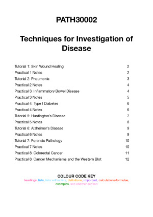 These notes comprehensively and concisely cover content from practicals and pre prac tutorials in the 12 week course. Time has been taken to focus on particularly difficult topics. Notes are brightly colour coded to help with clarity and memory. These notes contain sufficient background information for those with little pathology background, however, they also contain great amounts of detail that will assist you in achieving a high score in the PATH30002 subject. These practical notes will be greatly complemented by PATH30001 notes which covers very similar topics. Each week contains two sections of notes: - tutorial content relating to the theory behind the practical - practical notes taken after completing the practical, these are exceptionally useful for three reasons; knowing what to expect before entering the practical class, writing your weekly lab reports at a high standard, and for end of semester multiple choice exam revision I used these notes in semester 1 of 2021 to achieve a 92% in the Techniques for Investigation of Disease subject Practical topics covered include: - skin wound healing - pneumonia - inflammatory bowel disease - type I diabetes - Huntington's Disease - Alzheimer's Disease - forensic pathology - colorectal cancer - cancer mechanisms