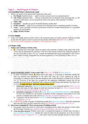 BENEFITS OF MY NOTES - These notes provide you with order and structure in how you approach problem questions. - You can just copy-paste the notes into your responses (or do some minor re-tweaking) and then apply your facts in sections that are highlighted. It really makes it that simple. - I have provided PINPOINTS as well having completed the readings and this will give you bonus marks in achieving that HD. - I promise you that these notes will the best set of notes that you will ever receive. I spent hundreds of hours perfecting these notes into these notes. MY GUARANTEE - This is what makes these sets of notes well worth the investment. Once you buy it I promise you that you will understand. LEGEND - Light Blue = Key principles - Pink = Case Names - Dark Blue = Legislation - Red / Bold = Anything Key to Note TOPICS 1. Real Property & Fixtures 2. Choses in Possession 3. Choses in Action 4. Assignment and Disposition of Interests 5A. Priority Regimes 5B. Commercial Dealings as Security Interests over Property