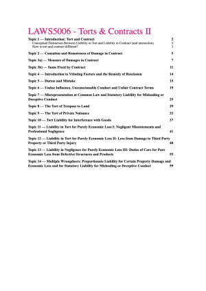 BENEFITS OF MY NOTES - These notes provide you with order and structure in how you approach problem questions. - You can just copy-paste the notes into your responses (or do some minor re-tweaking) and then apply your facts in sections that are highlighted. It really makes it that simple. - I have provided PINPOINTS as well having completed the readings and this will give you bonus marks in achieving that HD. - I promise you that these notes will the best set of notes that you will ever receive. I spent hundreds of hours perfecting these notes into these notes. MY GUARANTEE - This is what makes these sets of notes well worth the investment. Once you buy it I promise you that you will understand. LEGEND - Light Blue = Key principles - Pink = Case Names - Dark Blue = Legislation - Red / Bold = Anything Key to Note TOPICS 1. Introduction 2. Causation and Remoteness 3. Measure of Damages in Contract 4. Sums Fixed by Contact 5. Vitiating Factos 6. Duress and Mistake 7. Undue Influence, Unconscionable Conduct and Unfair Contact Terms 8. Misrepresentation and Misleading or Deceptive Conduct 9. Trespass to Land 10. Private Nuisance 11. Trespass to Goods 12. PEL 1 13. PEL 2 14. PEL 3 15. Proportionate liability