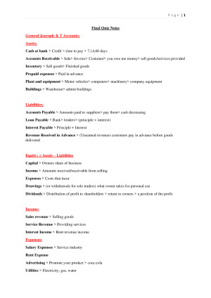 These are the extensive formulas I used within the cheat sheet I created purely for the final quiz/exam. I received Distinction for my over all grade. This covers: - General Journals & T Accounts - Liabilities - Equity: = Assets – Liabilities - Income - Expenses - Unadjusted Trial Balance - Adjusted Trial Balance - Post-Closing Trial Balance - Classification of adjusting entries -Deferrals/Revenue/Accrual/Accrued Revenue - Income Statements/All income - The Balance Sheet or Statement of financial position - Current assets/Non-current assets/Current liabilities/Non-current liabilities - Net Assets - Total Equity - Statement of Changes in Equity - Ratios - Profitability - Liquidity - Solvency - Management Accounting Costs - DM/DL/MOH - CVP Analysis - Variable Costs/ Fixed Costs/Contribution Margin/CM/BEP/ Margin of Safety/Target Profit - Sustainability - 3 Pillars/Key Drivers