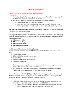 Course notes were taken from the textbook. Chapters Include: - Chapter 1: Marketing Strategy: A First Principles Approach - Chapter 2: Marketing Principle #1: All Customers Differ: Managing Customer - Chapter 3: Marketing Principle #2: All Customers Change: Managing Customer Dynamics - Chapter 4: Marketing Principle #3: All Competitors React: Managing Sustainable Competitive Advantage - Chapter 5: Marketing Principle #3: Managing Brand-Based Sustainable Competitive Advantage - Chapter 6: Managing Offering-Based Sustainable Competitive Advantage - Chapter 7: Managing Relationship-Based Sustainable Competitive Advantage - Chapter 8: All Resources are Limited: Managing Resource Trade-Off’s