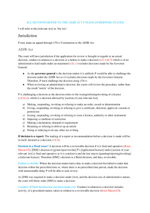 These notes were used to achieve a mark of 86 overall for the unit. The document includes a script for the exam, along with tips on how to answer the exam questions and what structure to adopt based on the question, and multiple essay plans on the topics of bias and privative clauses (also a one on merits review and one on reasons for decision). Good Luck! :) Topics covered - Merits Review - Jurisdiction - Standing - Reasons - All grounds of review - Procedural fairness - Jurisdictional error - Privative clauses - Remedies