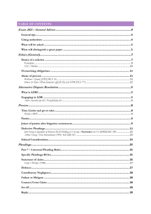 - Tips & tricks - Ethics (duties of a solicitor, overarching obligations, abuse of process) - ADR Process - Discovery & Disclosure - Privilege & Immunity (LPP, onus of privilege, waiving privilege) - Pre-Trial Investigations (notice to admit, interrogation, medical examination, witness statements, subpoenas) - Interlocutory applications & maintaining the Status quo (injunctions, freezing order, search order) - Costs - Principles of controlling litigation (res judicata, issue estoppel, anshun estoppel, judicial review)