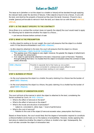 Comprehensive and detailed class test notes with script, compiled from lectures, readings and tutorials. These notes helped me achieve 87% on the class test. The script is designed for minimal stress throughout the test by: - Providing introductory sentence structures / example paragraphs - Inserting relevant cases and fact comparisons throughout - Including brief summaries of background information where required (such as types freehold estates etc.) Notes kept succinct for easy navigation due to strict time limit. Includes all topics that were examinable for the test during our semester: - Doctrine of Fixtures (+ removal of fixtures) - Doctrine of Estates - Doctrine of Waste - Legal and Equitable Interests - Doctrine of Conversion - Statutory Requirements for Sale of Land - Gifts of Personal Property/Chattels