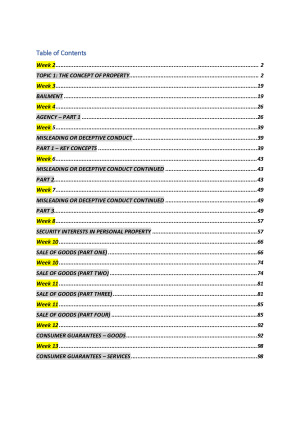 Notes covering the entire unit (weeks 1 - 13). They are extensive, detailed and are easy to follow, especially for the final exam. The notes cover all examinable topics such as bailment, misleading or deceptive conduct, sale of goods, consumer guarantees etc. These notes also include all relevant the case law with summaries. Great resource for exam!
