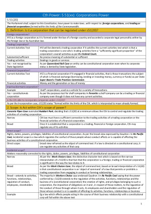 Easy to use, concise notes with visual cues, structured based on how problem questions should be answered! Includes succinct summaries of major cases. Topics: - s51(xx): Corporations Power - s96 - Grants Power - ss81 & 83: Appropriations and Expenditure - State legislative power, manner & form - The Separation of Judicial Power (Federal & State) - Intergovernmental Immunities - Political Freedom of Political Communication (IFoPC) - Right to Vote - s92: Freedom of Interstate Trade and Commerce - s109: Inconsistency