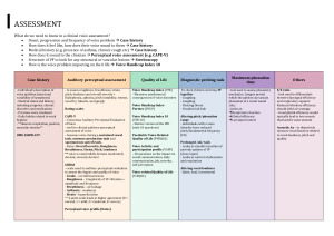 Swallowing and Voice: Summary tables for the types of voice disorders, assessments and management/interventions that were introduced in lectures. I originally had images in the tables but have removed them due to the guidelines. I have left the tables in the pdf for those who would like a template on how I would usually organise notes that include visual observations for this subject. Headings - Assessment - ICF and Voice - Voice Quality (Types of voice disorders) - Laryngoscopy/Stroboscopy Appearance: Template - Treatment (for different approaches/targets) - Surgery Therapy - Paediatric Voice Therapy