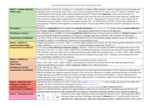 Concise summary of concepts covered from week 1-12. Colour coded by topic. Used as a cheat sheet in the final exam, can be used as summary notes. STATA commands coloured in blue to differentiate. Includes formulas, model assumptions and steps. Topics: - Week 1 – multiple regression - Week 2 – ANOVA via regression - Week 3 – ANCOVA via regression - Week 4 – interactions with continuous variables and curvilinear regression - Week 5 – badly behaved data - Week 6 – model reduction and building - Week 7 – categorical data - Week 8 – logistic regression - Week 9 – repeated measures - Week 10 – Issues in 1-way repeated measures - Week 11 – repeated measures to 2 factors - Week 12 – mixed designs