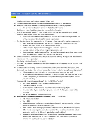 HD HRM Capstone notes, including various tutorial and lecture notes, additional materials and readings 1. Introduction to HRM Capstone 2. What is HRM Research? 3. Finding and reviewing the literature 4. Designing the research 5. Collecting & recording qualitative data 6. Collecting & recording quantitative data 7. -- No week 7 material, self-study week -- 8. Analysing and presenting qualitative data 9. Analysing and presenting quantitative data 10. Communicating research findings and crafting recommendations 11. Analysing data tutorials 12. --No week 12 material, week to finalise assessments --