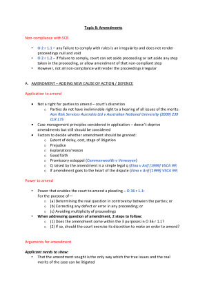 A 22 page easy-to-follow summary. 1-3 page summary of each topic. Includes the key legislation sections and cases for topics. Includes the following topics: Topic 1: The System of Civil Justice Topic 2: Commencement of Proceedings Topic 3: Service of Process Topic 4: Appearance Topic 5: Joinder of Claims and Parties Topic 6: Pleadings Topic 7: The Trial (Summary Disposition) Topic 8: Amendments Topic 9: Discovery Topic 10: Costs TOPIC 11 - Trial DISCLAIMER: Given this document was created/used in T2 2020, you should confer with the current unit resources, your own notes and applicable legislation to ensure content is up to date.
