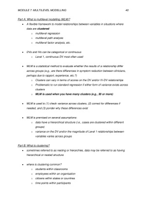 These notes are up-to-date (T2 2021) and synthesize information from the lectures, seminars, and textbook (Field, 2018). Gives you everything you need to know for the exam, so if you're doing your thesis too, these notes will be a massive time-saver!! Covers all content taught throughout the trimester: Week 1: Multiple Regression Week 2: Logistic Regression Week 3: Mediation and Moderation Week 4: Path Analysis Week 5: Confirmatory Factor Analysis Week 6: Structural Equation Modelling Week 7: Multilevel Modelling Week 8: Exploratory Factor Analysis Week 9: Multivariate Analysis of Variance (MANOVA) (Week 10 and 11 do not have content) Cheers and good luck with your studies!! :)