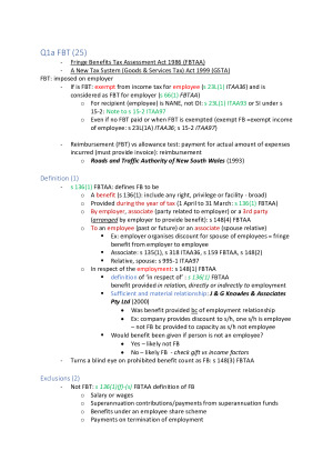This Taxation Law I notes are comprised for the exam in semester 2, 2021. Content: the exam includes 3 questions regarding - FBT consequences - Taxable income consequences - Income tax consequences - Residency These notes have specifically organised those content in the order of the questions and detailed the steps to analyse and answer those questions. Specifically, the FBT question may also cover knowledge from deduction and GST, which are also included. Best of luck with your study!
