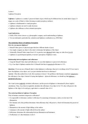 These notes cover the whole Perception, Memory and Cognition course comprehensively and in detail. All lecture content is covered in these notes, and further detail is given for more difficult concepts. These lecture notes are a comprehensive guide not only the lecture content, but also to what the lecturers are saying (very similar, almost transcription-like). These notes are perfect for studying for the assignment and exam. Using these notes I achieved a score of 90. Lecture 1-4: Piers Howe's Section - Lightness Perception - Multiple Object Tracking - Selective Attention and Visual Awareness - Visual Memory Lecture 5-8: Phillip Smith's Section - Decisions, Judgement and Choice - Signal Detection Theory - Response Time (RT) The Speed of Information Processing - Complex Decision Making Lecture 9-12: Dan Little's Section - Feature Processing in Categorization - Information Processing and Cognition - The Information Processing Approach to Memory - Neuroscience and Systems of Categorization