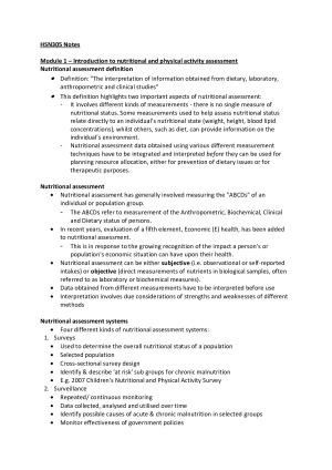 This document contains all content covered in weeks 1-11 of HSN305, summarised in an easy to follow reference. This document has been typed in an easily understandable, and simplified way. The content has been categorised weekly, which helps you isolate the content required for the unit quizzes. Specific topics covered in this document include: - Introduction to nutritional and physical activity assessment - Anthropometric and Body Composition Assessment - Measuring Food and Nutrient Intake - Assessing Physical Activity – Subjective Measure - Reproducibility, validity and measurement errors - Evaluation of Dietary Data Additionally, this document contains easy ways to memorise important information using mnemonics and examples, which are all beneficial for exams.