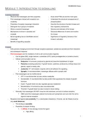 Complete and detailed notes for BCMB30004: Cell signalling and Neurochemistry, covering the entire updated content from 2021 (see contents). Bullet point formatted with key works in bold and colour used to help visual learners and to emphasise important points. I used only these notes to study and got an overall 87 in the subject (100 on the second MST and 90 on the exam). They come with all learning outcomes clearly outlined before each module for easy access, to help focus your studying and test your knowledge. Good luck! Contents: 1. Introduction to signalling 2. GPCR signalling 3. GPCR structure and function 4. Nuclear receptors 5. Ubiquitin 6. Autophagy 7. Cell death 8. Immune signalling 9. Pain I 10. Pain II